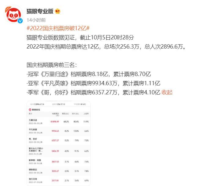 据猫眼专业版数据,截至10月5日20时28分,2022年国庆档期总票房达12亿元,总场次256.3万,总人次2896.6万。