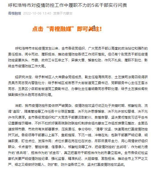 荔枝新闻讯 据“青橙融媒”微信号消息,内蒙古呼和浩特市本轮疫情发生以来,全市各级党组织、广大党员干部以高度的政治站位和强烈的责任担当,闻令而动、履职担当,推动疫情防控各项工作闭环落实。但仍有个别党员干部在疫情防控紧要关头,呼和浩特市委、政府三令五申之下,麻痹大意、懈怠松劲,作风不扎实、履职不到位,影响全市疫情防控工作大局。