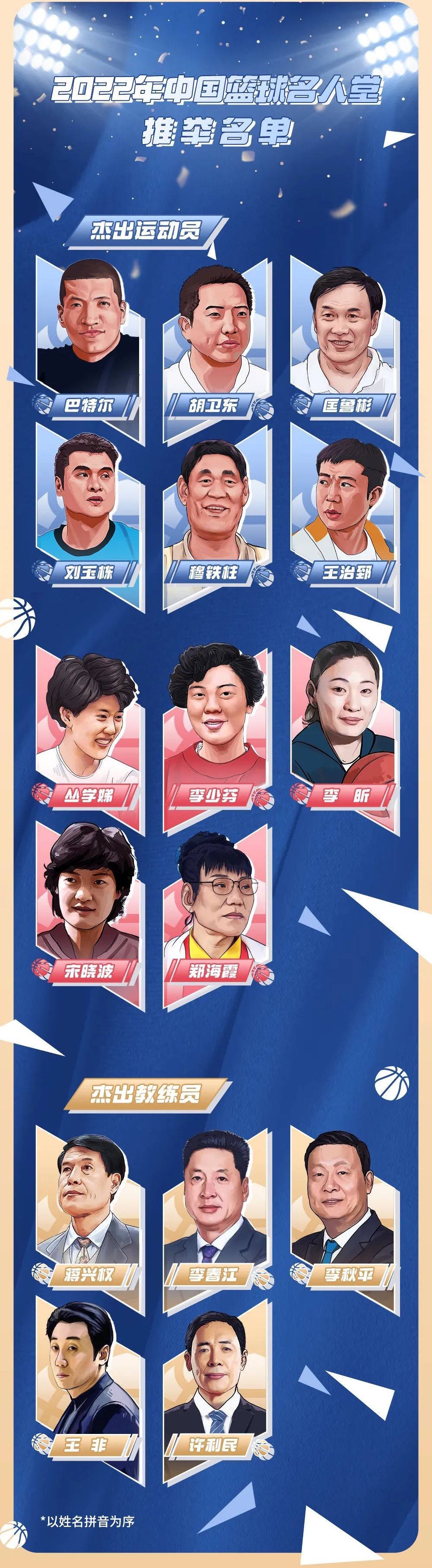 据介绍,这份16人的名单将由中国篮球名人堂终审委员会进行审定,并从中产生10人(包括4位男运动员、3位女运动员和3位教练员),与15位“特别致敬人物”以及优秀集体——“新中国篮球运动五十杰”一起,共同进入2022年中国篮球名人堂。