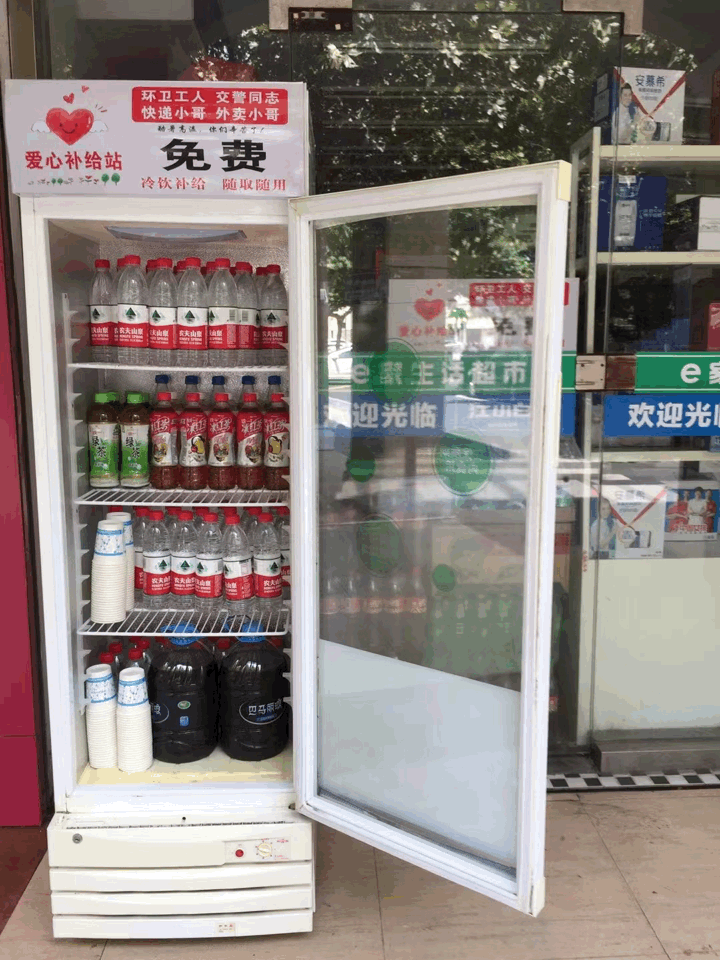 在苏州太仓的大街小巷,总共有19台爱心冰箱,免费为环卫工人、交警等户外工作者提供饮用水。这些“爱心冰箱”都是由叶玉萍发起投放的。
