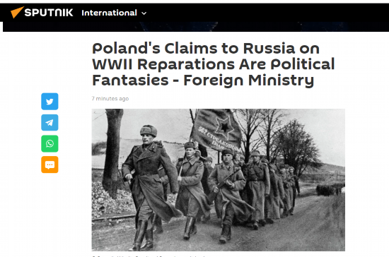 俄卫星社称,波兰政府此前表示,他们要求德国赔偿6.2 万亿兹罗提(兹罗提是波兰货币,约合9.2万亿元人民币),作为对二战造成的损失的赔偿。与此同时,波兰政客多次表示,他们不仅希望得到德国的赔偿,还希望得到俄罗斯的战争赔偿。