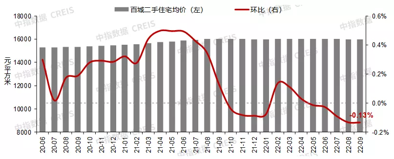中指研究院公布的最新数据显示,2022年9月,全国100个城市的新房平均价格为16200元/㎡,环比下跌0.02%,已连续3个月下跌;同比则上涨0.15%,涨幅较8月收窄0.17个百分点。其中,表现最好的是二线城市,9月房价环比持平,同比上涨0.61%,一线和三四线代表城市的环比及同比均不同程度下探。