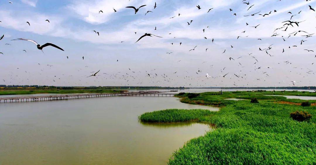 七里海湿地生机勃发,各种鸟类在湿地上空结伴翱翔