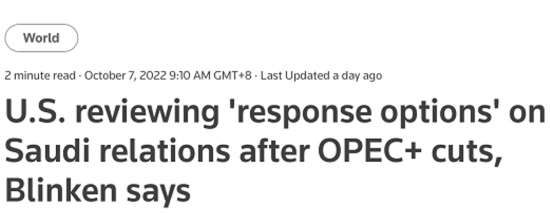石油输出国组织(欧佩克)与非欧佩克产油国第33次部长级会议5日在奥地利维也纳举行,会议决定从11月起将原油总产量日均下调200万桶。美国政治新闻网称,这一决定激怒了美国,一些政客提出多项报复措施,包括重新审查美国与沙特的关系,从沙特撤出美国军队等。据路透社7日报道,美国国务卿布林肯当天在记者会上称,美国正在审查应对与沙特关系等各种方案。