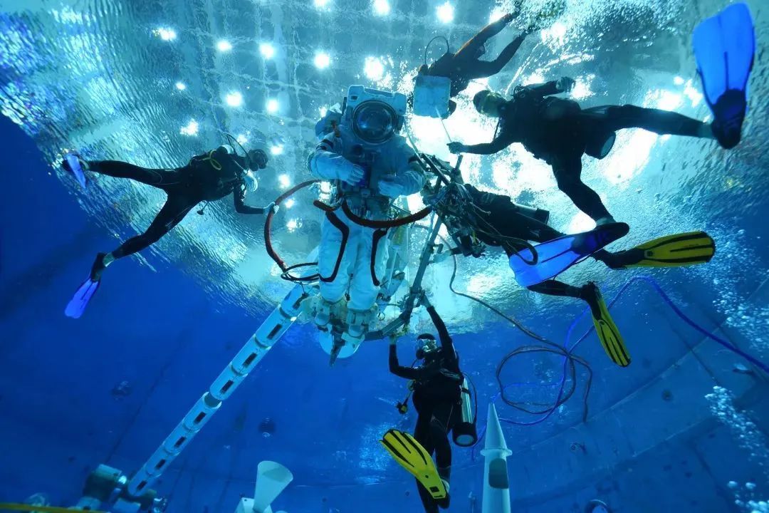 如果还嫌失重环境不够逼真,航天员就要体验中性浮力水槽。水下有同比例布置的空间站舱段模型,航天员必须穿上特制的带有铅块的训练服,负重达200公斤,每次在水下训练数小时,几乎每天都要重复。训练服的重量控制精准巧妙,让人体悬浮在水下,提供了近乎失重的环境,便于航天员练习舱外活动和出舱步骤,另有多个复杂的单项训练。