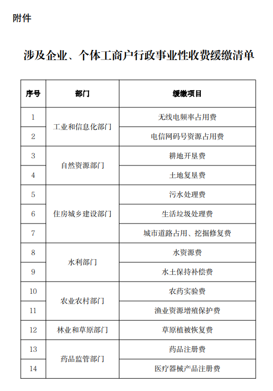 二、《涉及企业、个体工商户行政事业性收费缓缴清单》包括耕地开垦费、污水处理费等14项收费(具体项目见附件)。