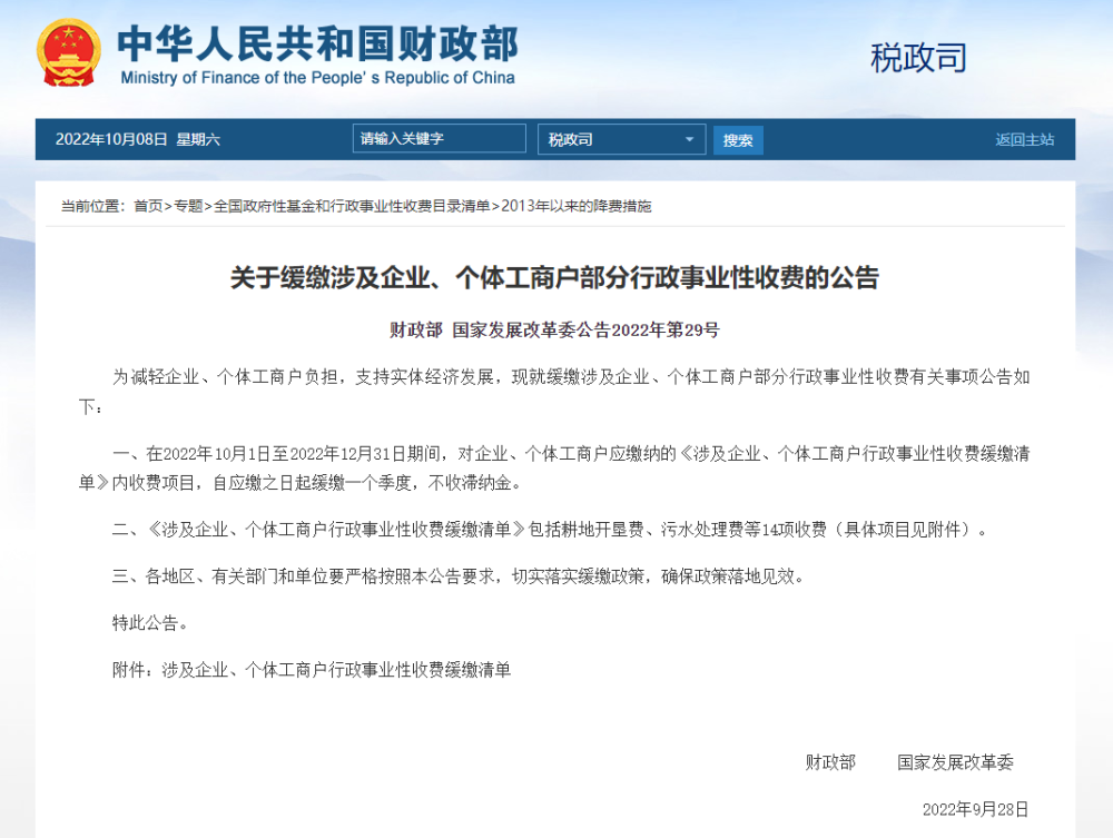 一、在2022年10月1日至2022年12月31日期间,对企业、个体工商户应缴纳的《涉及企业、个体工商户行政事业性收费缓缴清单》内收费项目,自应缴之日起缓缴一个季度,不收滞纳金。
