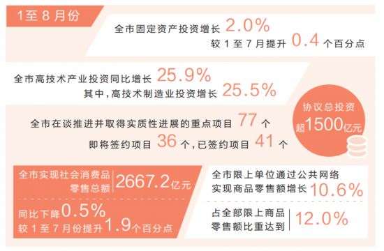 固定资产投资稳中有升,高技术产业投资增长较快。1至8月份,全市固定资产投资增长2.0%、较1至7月提升0.4个百分点。全市高技术产业投资同比增长25.9%。其中高技术制造业投资增长25.5%,招商引资工作高歌猛进。全市在谈推进并取得实质性进展的重点项目77个,协议总投资超1500亿元,其中即将签约项目36个,已签约项目41个。