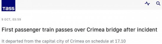 报道还称,一家俄罗斯运输公司当地时间8日告诉记者,克里米亚大桥当天发生爆炸后,一辆客运列车于当地时间8日17时许从克里米亚出发,目前已经通过克里米亚大桥,这是事故发生后第一辆通过大桥的列车。