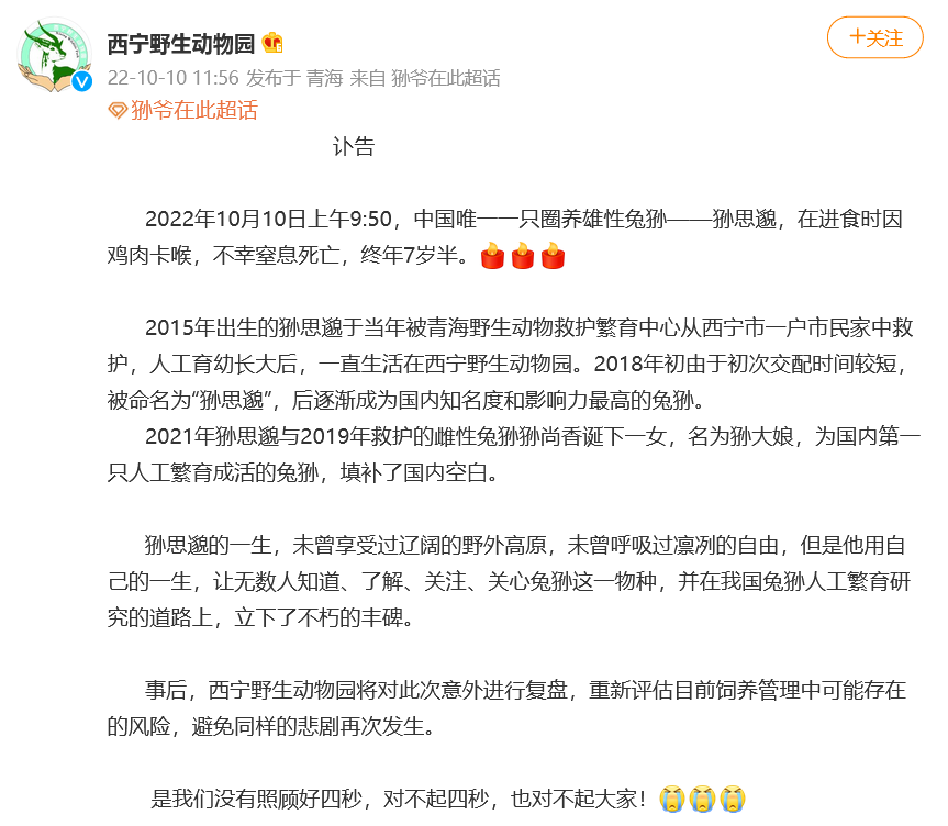 荔枝新闻讯 10月10日,据@西宁野生动物园 发布讣告,中国唯一一只圈养雄性兔狲——狲思邈,在进食时因鸡肉卡喉,不幸窒息死亡,终年7岁半。