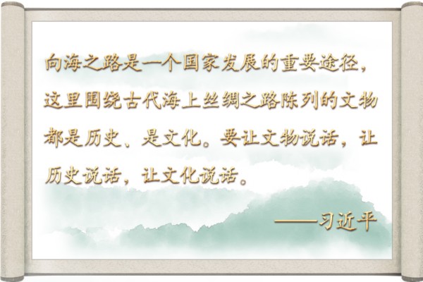 习近平总书记说,向海之路是一个国家发展的重要途径,这里围绕古代海上丝绸之路陈列的文物都是历史、是文化。要让文物说话,让历史说话,让文化说话。要加强文物保护和利用,加强历史研究和传承,使中华优秀传统文化不断发扬光大。