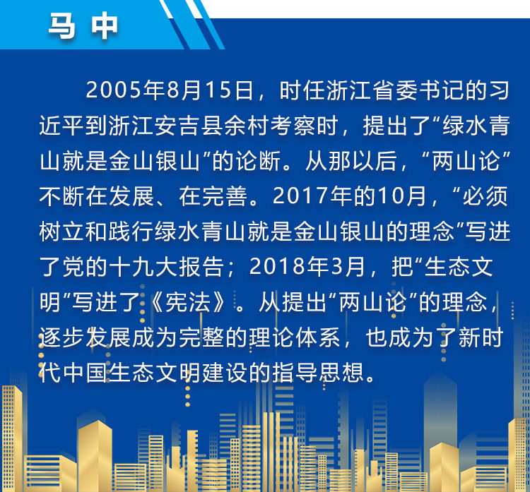 2005年8月15日,时任浙江省委书记的习近平去浙江省湖州市安吉县天荒坪镇余村考察,提出“绿水青山就是金山银山”。2020年,习近平总书记再赴余村。