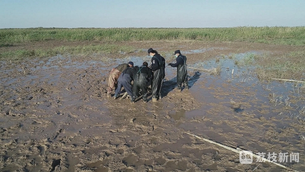 负责该区域巡逻的射阳县海涂公司保安队长蔡立军告诉记者,他们是每天正常在这个区域里巡逻,今天发现这边有几头麋鹿在这里,另外有一头麋鹿被缠在那里,我们巡逻的人员就下去看了一下,结果发现这头麋鹿的头部被鱼网和铁丝等给缠住了。由于麋鹿被困的位置在滩头的沼泽地里,海防民警随即穿上半身防水皮裤子,与保安人员一起涉水步行过去,先用携带的钢叉固定住麋鹿的头部,然后用老虎钳慢慢断开缠在麋鹿角上的鱼网和铁丝。