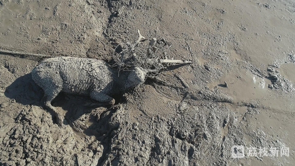 接到报警,射阳县公安局河闸海防派出所迅速组织民警前往,在保安人员的引导下,民警驾驶警车沿着滩头的崎岖小路赶到了现场附近,通过无人机搜寻定位,在距离路边大约800米左右的滩头沼泽地里,一头成年麋鹿侧躺在那里,一动也不动,浑身沾满了泥巴,头部的角上有鱼网、铁丝类的东西缠绕着。
