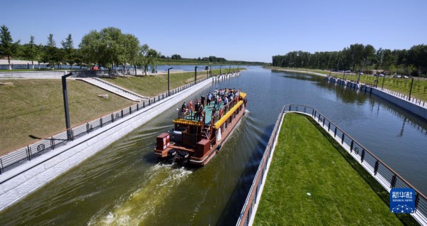 2022年6月24日,京杭大运河京冀段全线62公里实现游船通航。这是载着北京游客和建设者代表的游船通过船闸进入京杭大运河河北段。新华社记者 李欣 摄