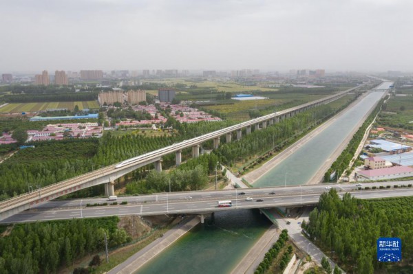 在河北省石家庄市正定县以北的于家庄村附近,南水北调中线干渠与高铁、公路交织(2021年5月24日摄,无人机照片)。新华社记者 才扬 摄