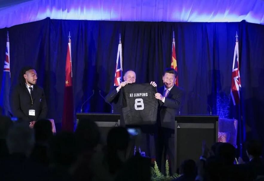 2014年11月20日,新西兰首都惠灵顿,中国国家主席习近平与时任新西兰总理约翰·基共同会见记者。记者会结束之际,英式橄榄球球星、全黑队球员玛阿·诺努走上台,向习近平赠送了该队的标志性黑色球衣,号码是中国老百姓喜闻乐见的数字“8”。