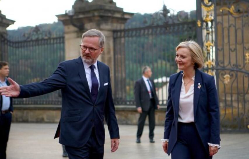 资料图:10月6日,捷克总理菲亚拉迎接前来参加首届欧洲政治共同体领导人会议的英国首相伊丽莎白·特拉斯(右)(新华社)