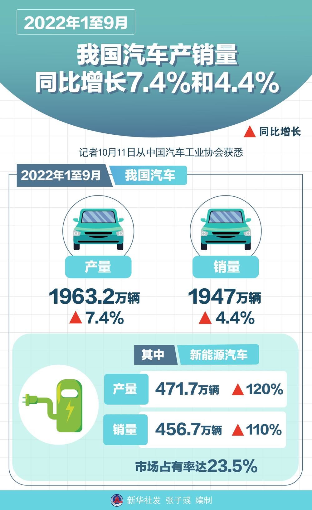 新华社北京10月11日电(记者高亢、戴小河)记者11日从中国汽车工业协会获悉,今年1至9月,我国汽车产销量分别达1963.2万辆和1947万辆,同比增长7.4%和4.4%。其中,新能源汽车产销量分别达471.7万辆和456.7万辆,同比增长120%和110%,市场占有率达23.5%。