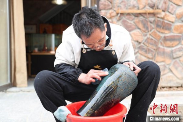 图为10月10日,宁夏银川大漆技艺匠人谢立雄对漆器进行打磨。 中新社记者 于晶 摄
