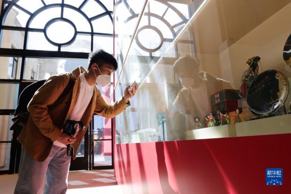 10月10日,观众在“奋进新时代”主题成就展第五单元“坚定文化自信 建设社会主义文化强国”展厅拍摄展示代表性非遗作品和文创精品的博古架。新华社记者 张玉薇 摄
