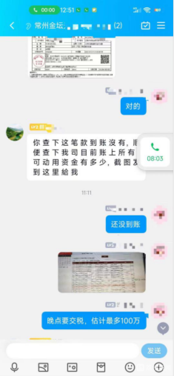 “老板”先是询问了税务稽查局“专员”情况,之后说有一笔货款要收,要求小陈将公司开票资料发至群内。“老板”接着发来一张虚假汇款记录,要求核查是否到账并报告公司账户内余额情况。