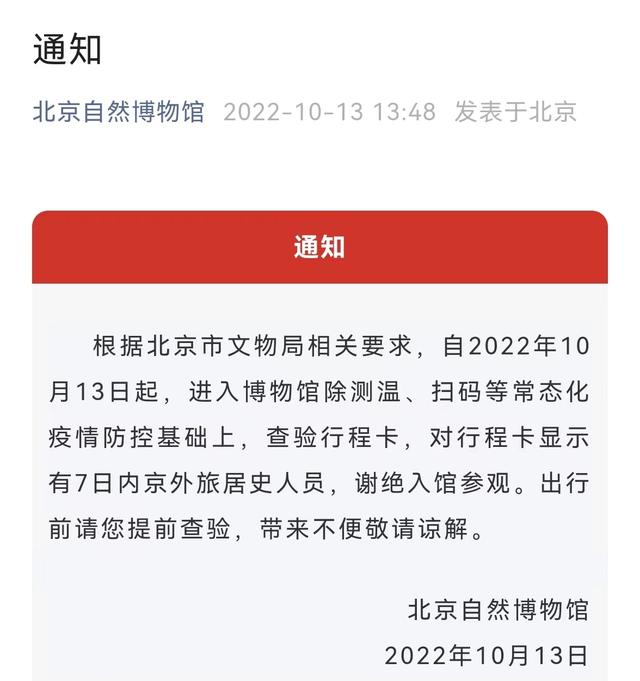 荔枝新闻讯 据北京自然博物馆官微消息,根据北京市文物局相关要求,自2022年10月13日起,进入博物馆除测温、扫码等常态化疫情防控基础上,查验行程卡,对行程卡显示有7日内京外旅居史人员,谢绝入馆参观。出行前请您提前查验,带来不便敬请谅解。