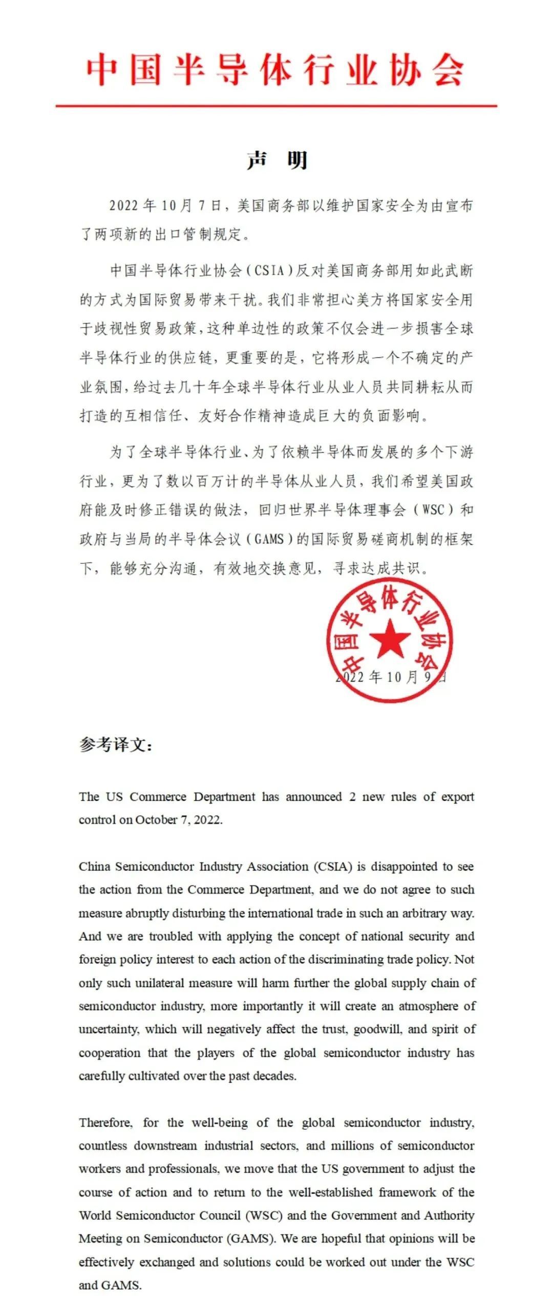 中国半导体行业协会(CSIA)反对美国商务部用如此武断的方式为国际贸易带来干扰。我们非常担心美方将国家安全用于歧视性贸易政策,这种单边性的政策不仅会进一步损害全球半导体行业的供应链,更重要的是,它将形成一个不确定的产业氛围,给过去几十年全球半导体行业从业人员共同耕耘从而打造的互相信任、友好合作精神造成巨大的负面影响。