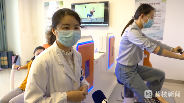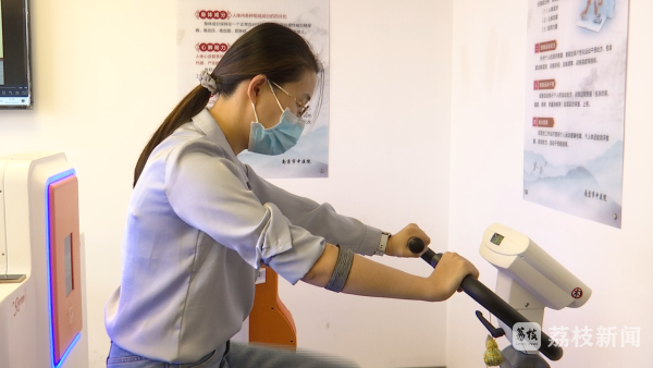 在南京市体育医院体适能测试区域,医生正在为市民进行检测。南京市中医院主治中医师杨敏介绍:“这是功率车的检测,主要是看她的心肺功能,根据她的身高、年龄、体重以及刚刚做的人体成分,会给她测一个最大的安全心率。”