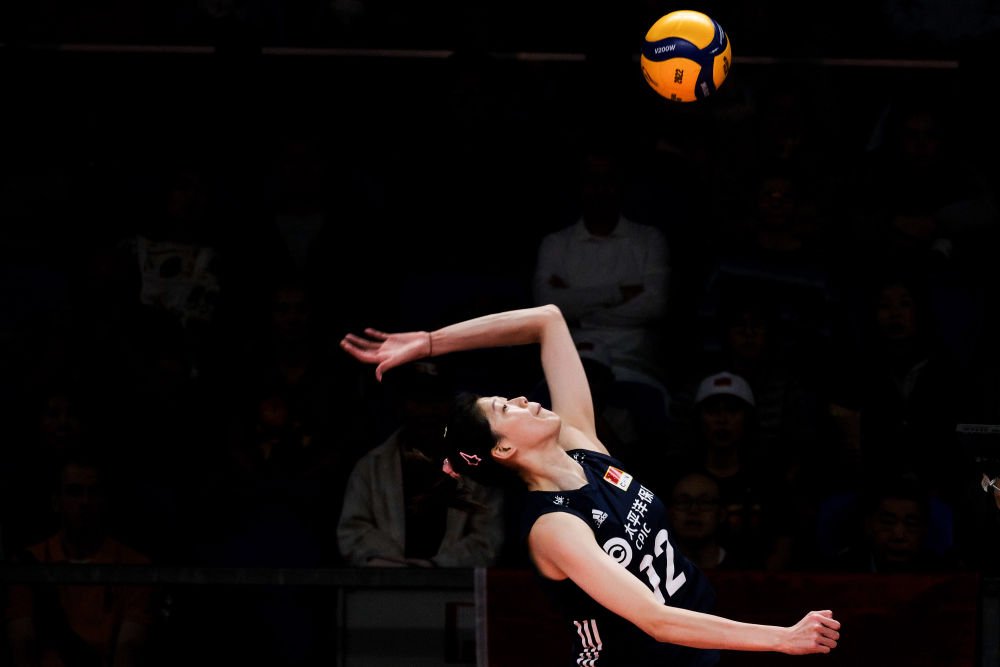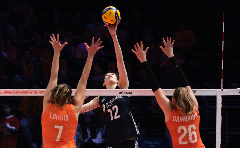 10月6日,中国队球员李盈莹(中)在对阵荷兰队的16强E组复赛中吊球。新华社记者 孟鼎博 摄