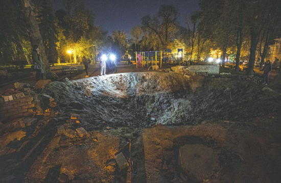 克里米亚大桥被炸后,俄罗斯连续多日对乌克兰进行报复性空袭。图为乌克兰首都基辅民众15日晚在一个弹坑边查看。 (视觉中国)