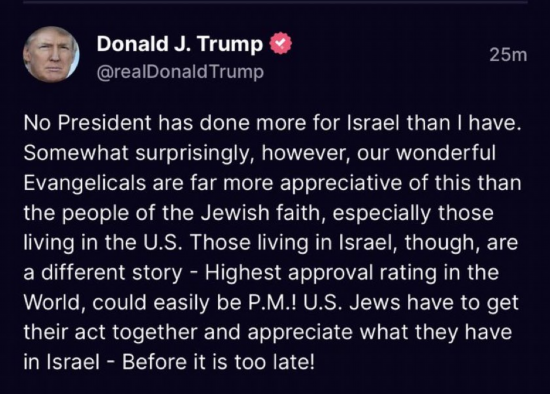 RT称,特朗普16日在其社交媒体平台上发文,说到了自己在美国犹太人和以色列人中截然不同的“人气”现状。“没有哪位(美国)总统比我为以色列做得更多。然而,令人有些惊讶的是,我们优秀的福音派教徒远比那些信奉犹太教的人,特别是那些生活在美国的信奉犹太教的人更欣赏这一点”。特朗普称。