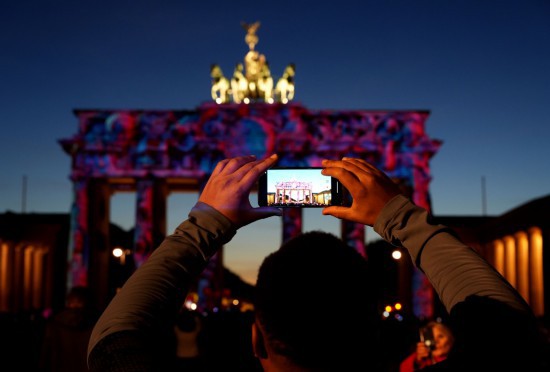 10月7日,在德国柏林,一名游客拍摄被灯光点亮的勃兰登堡门。新华社发(斯特凡·蔡茨摄)