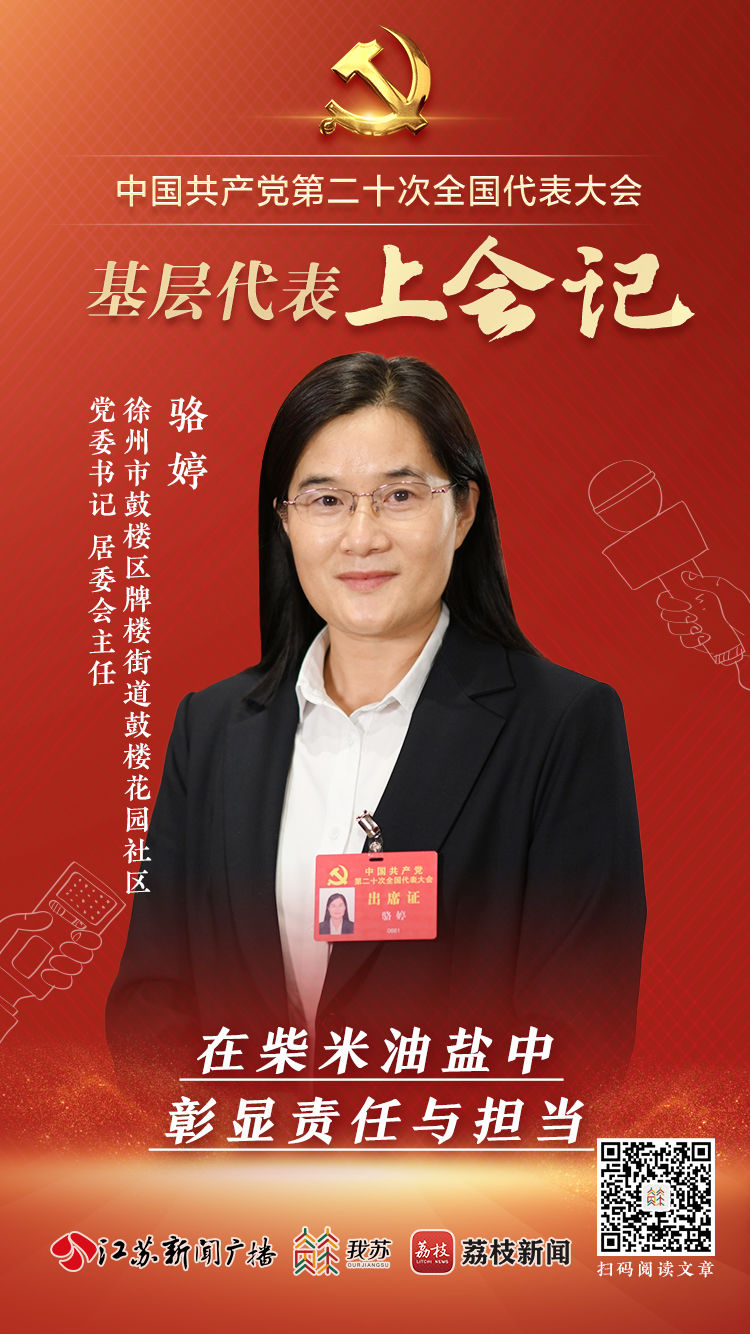 党的二十大代表、徐州市鼓楼区牌楼街道鼓楼花园社区党委书记、居委会主任骆婷,从事社区工作已经十九年。今天(10月17日)的《基层代表上会记》,我们来认识这位基层党代表——骆婷。
