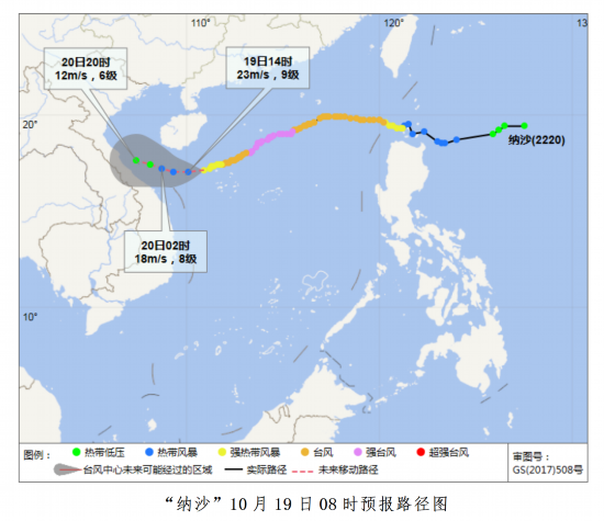 记者10月19日早晨从海南省气象部门获悉,受今年第20号台风“纳沙”(强热带风暴级)和冷空气共同影响,18日08时—19日06时,海南岛四周沿海陆地及近海普遍出现8~10级阵风,三沙市最大阵风出现在北礁14级(42.8米/秒)。海南省气象台预计,“纳沙”19日白天将从海南岛南部海面掠过,20日在北部湾南部海面减弱消散。预计,19日台风中心经过的附近海面旋转风8~10级、阵风11~12级,19—21日海南省有强风雨天气。据悉,海南省气象局于10月19日09时20分继续发布台风三级预警和暴雨三级预警。