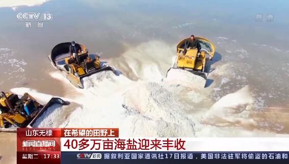 山东滨州无棣县位于渤海湾畔,有着广袤的沿海滩涂地,在生产海盐方面具有区位优势。眼下,当地40多万亩盐田迎来了收获期。