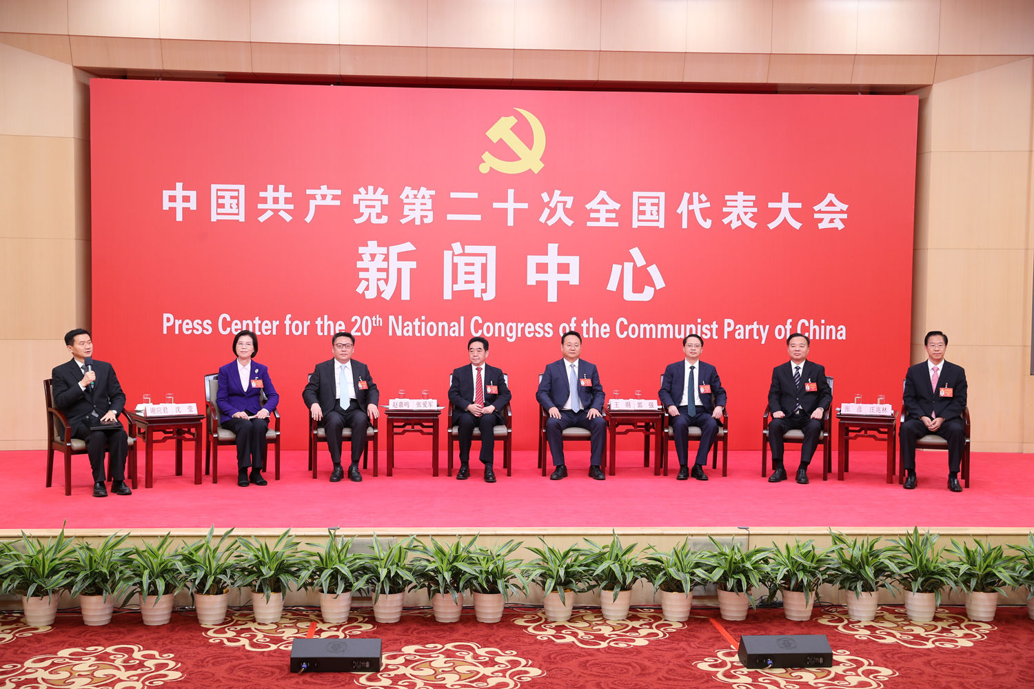 10月18日,中国共产党第二十次全国代表大会新闻中心举行集体采访。黑龙江、上海、江苏、浙江、安徽、福建、江西代表团新闻发言人出席,介绍代表团学习讨论二十大报告情况,并回答记者提问。国新网 徐想 摄