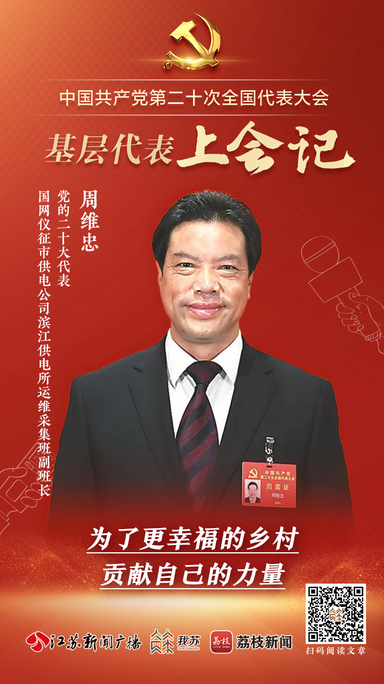 党的二十大代表、国网江苏省电力有限公司仪征市供电分公司滨江供电所运维采集班副班长周维忠,从“农电工”到驻村“第一书记”,扎根农村服务35年来,他用实际行动诠释着为民初心。他说,要把乡村变化和乡亲的期盼带到大会上,让乡村振兴路更宽阔。今天的《基层代表上会记》,让我们来听一听他的声音。