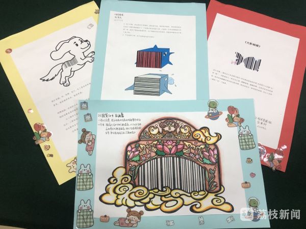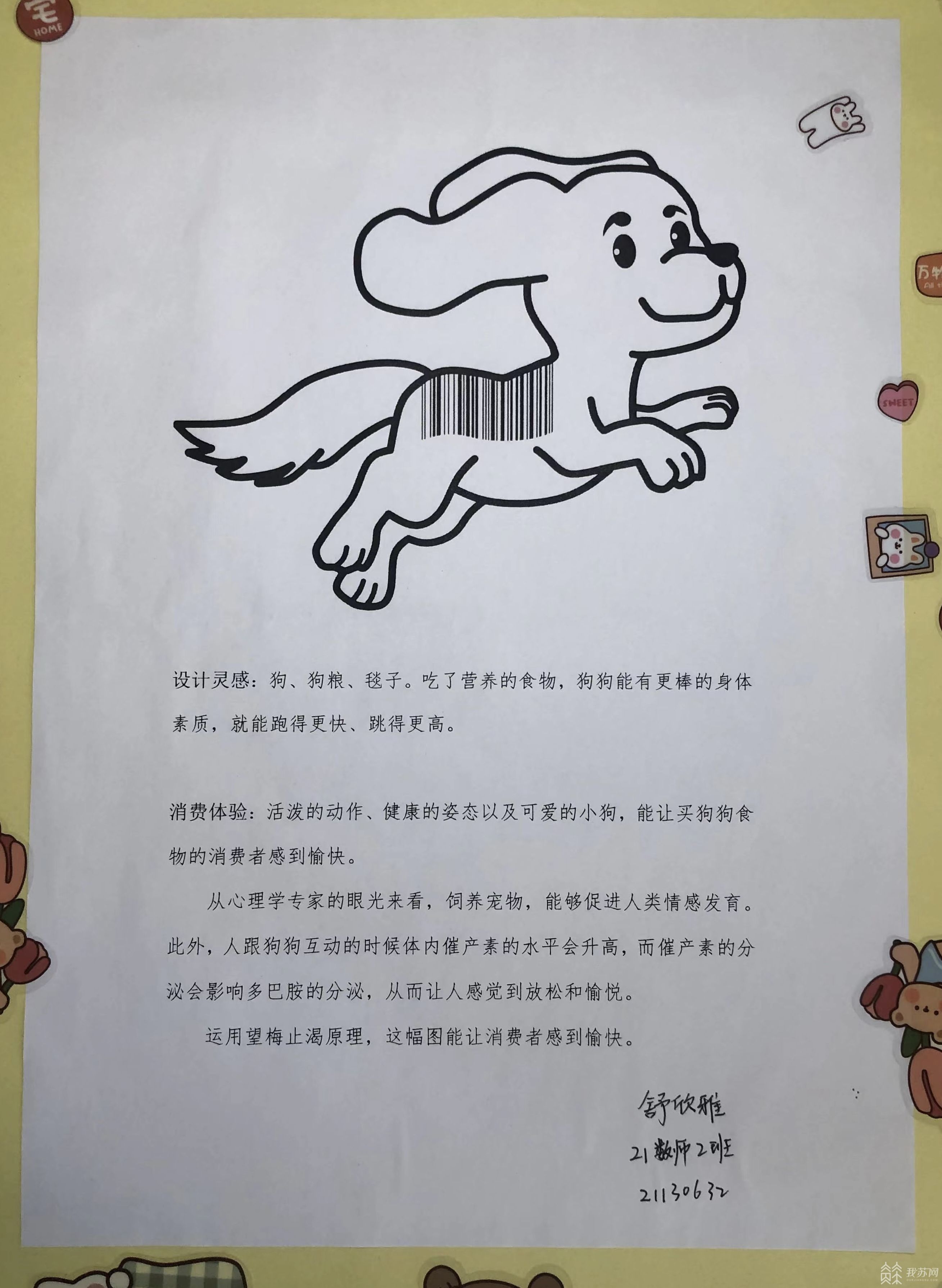 2021级数学师范2班舒欣雅喜爱宠物,她以小狗为元素设计出印在宠物食品包装袋上的创意条形码,原本单调的黑白线条在她的作品上变得生动有趣。