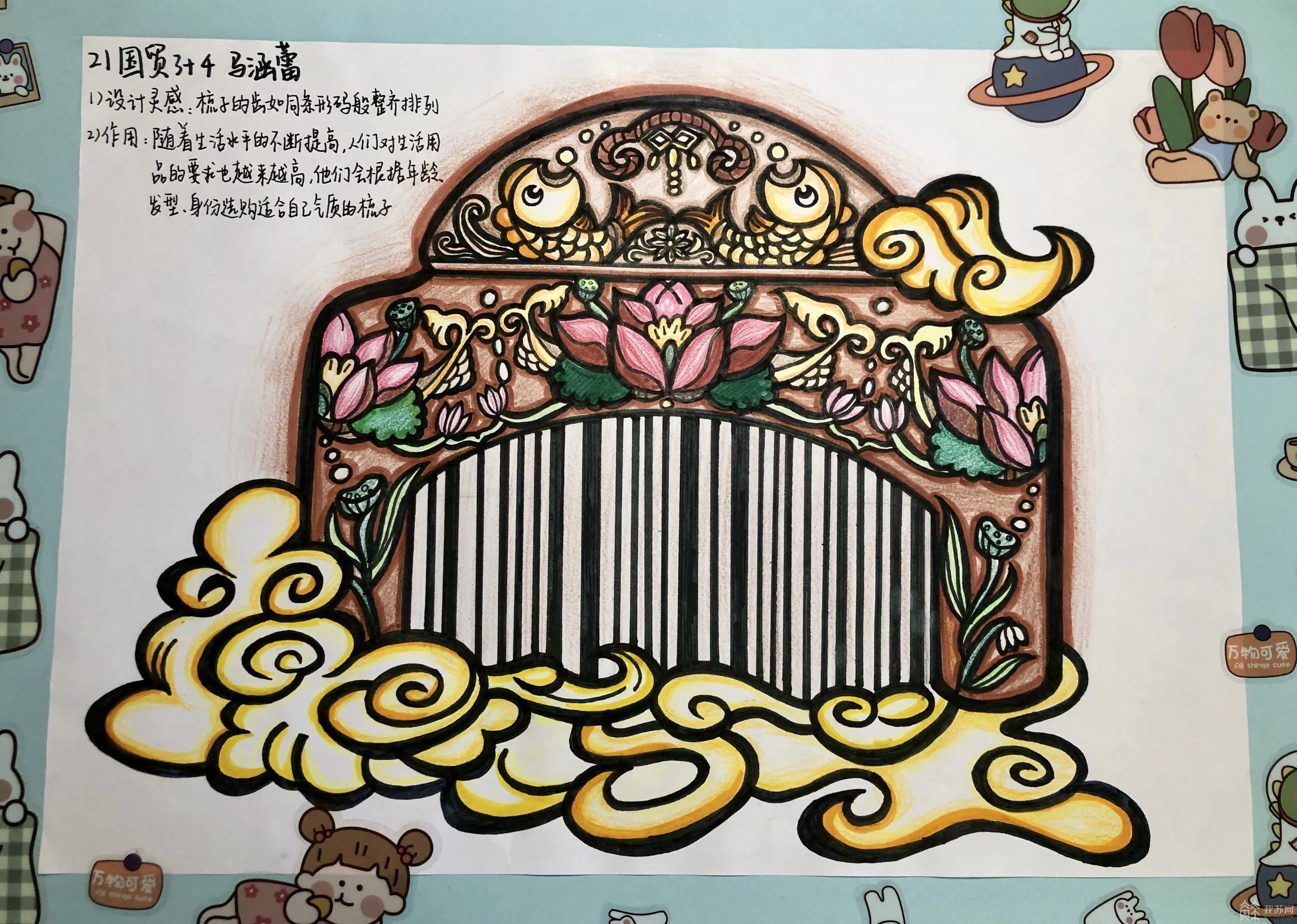 2021级国际经济与贸易(3+4)班的马涵蕾以中国传统手工用品梳篦为创作原型,设计出带有中华传统文化元素的条形码作品。