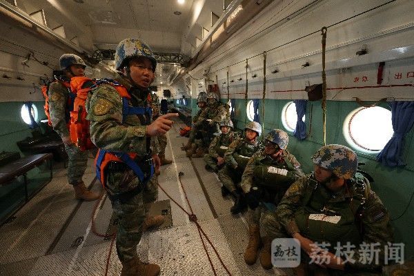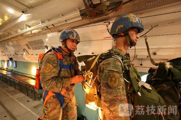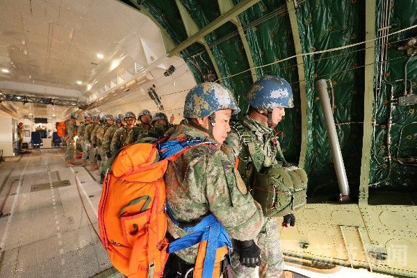 “活动活动手腕脚腕,做好离机准备!……”空中投放员为跳伞员检查伞具、加油打气,再次强调离机的动作要领和注意事项。