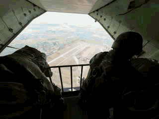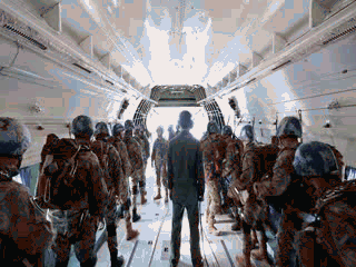 战机尾门缓缓打开,倒吸入机舱内的寒气提醒着跳伞员们抖擞精神。