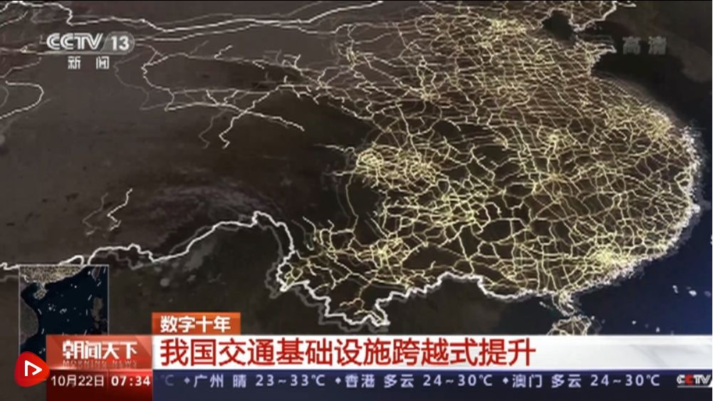 公路、铁路新增的近两万座隧道、30多万座桥梁穿山越海连路成网。如今每100平方公里中就有超过55公里的公路。十年来,我国公路里程增加104万公里,其中,农村公路净增90多万公里。