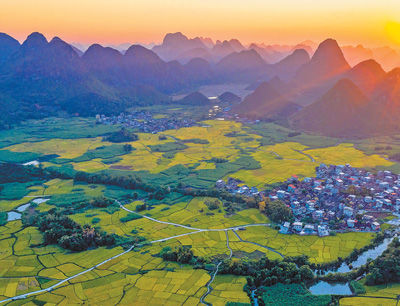 金秋十月,广西壮族自治区柳州市柳城县古砦仫佬族乡,金黄的稻田与群山、道路、村落构成一幅田园画卷。