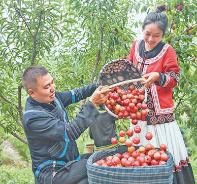 四川省泸州市叙永县水潦彝族乡海涯村,退捕渔民在采摘李子。