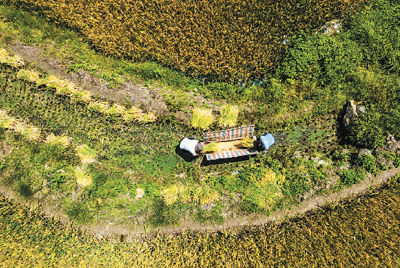 2022年9月至10月中旬,世界遗产地哈尼梯田的稻谷相继成熟,从山脚到山顶,村民们陆续开镰收割。