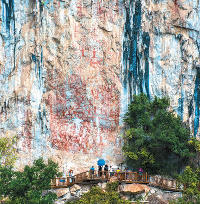 花山岩画吸引了大批游客慕名前来参观。