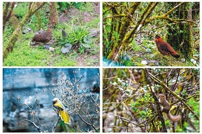 图为2022年4月在贵州梵净山国家级自然保护区拍摄到的红胸角雉雌鸟、橙翅噪鹛、红胸角雉雄鸟和松鼠。