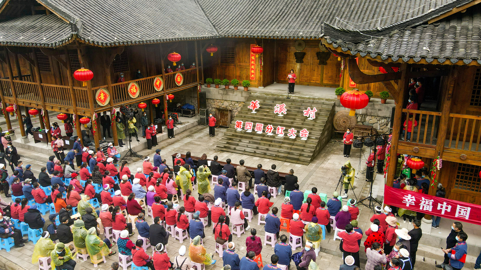 2019年4月15日,习近平总书记来到重庆市石柱土家族自治县中益乡华溪村考察。四年来,石柱人民牢记嘱托向前跑,山乡巨变展新颜。这是2022年4月15日,华溪村第四届分红大会现场。图/李玉霞