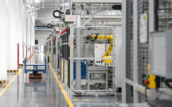 法士特西安高智新公司变速器零件数字化生产线,智慧物流小车在进行物品运输。新华社记者刘潇摄于2022年4月21日